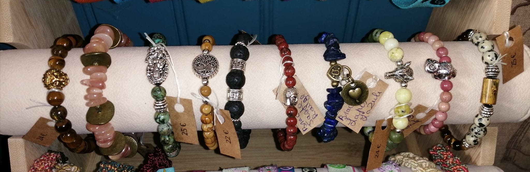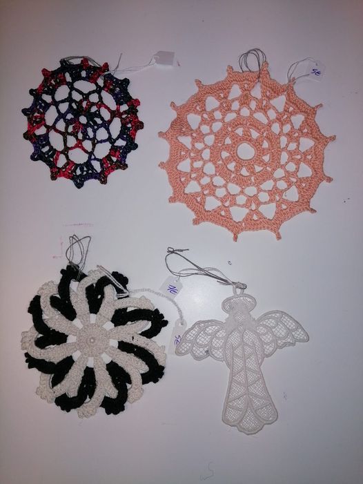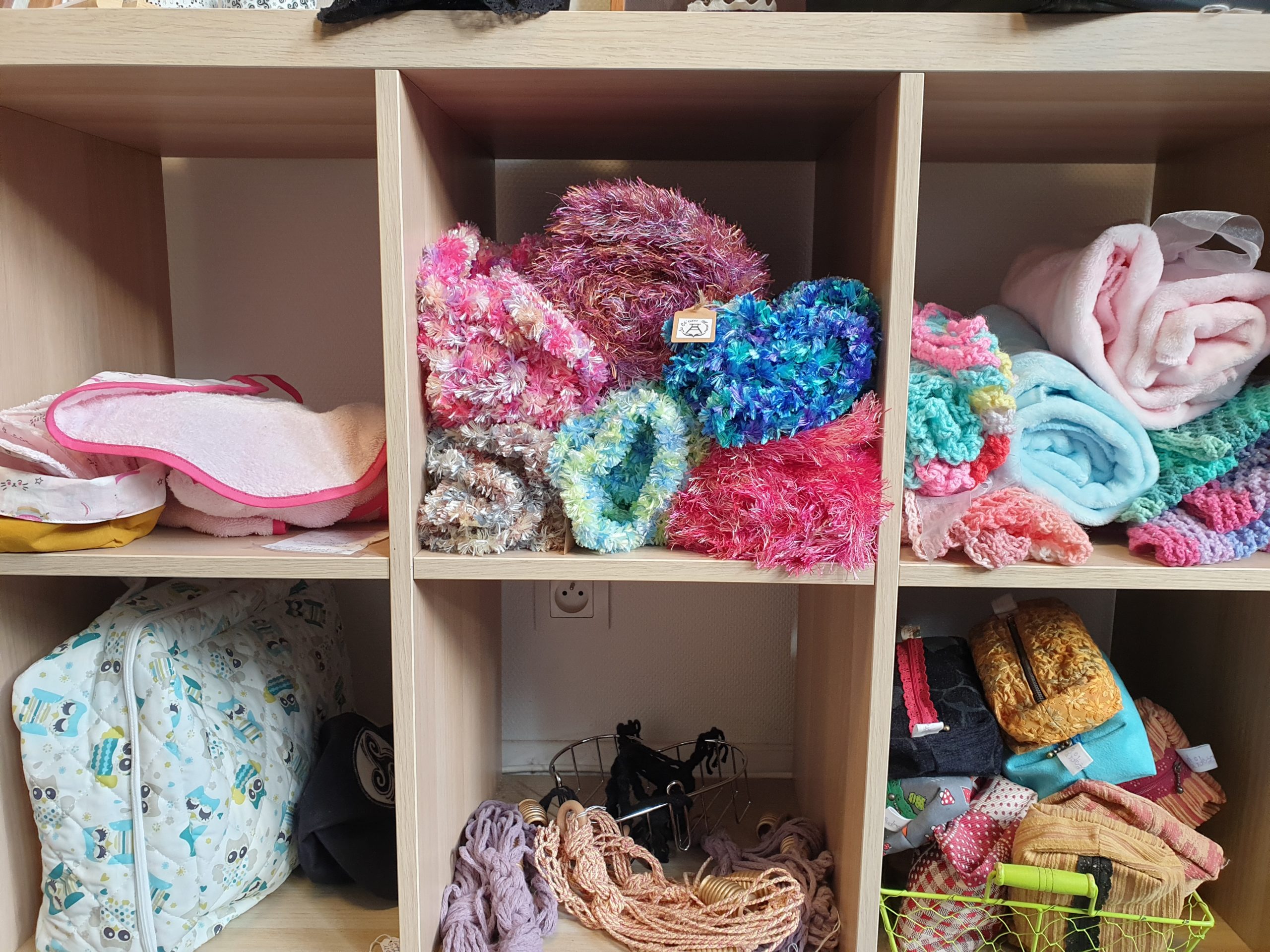 Camille réalise des décorations en macramé, Sandrine confectionne des bijoux en pierres naturelles, Vanessa crée des décorations en matériaux recyclés et les Ch’tites Mimines proposent des accessoires en tricot, broderie, points de croix…