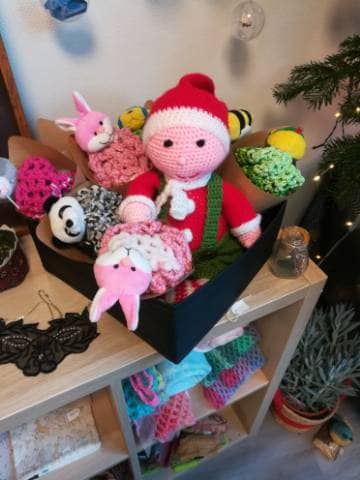 Vous l’avez peut-être vu en boutique, en ce mois de l’Avent, j’ai l’honneur d’accueillir un lutin facétieux crocheté par Jeanine de Bannalec. Je pensais qu’il serait chaleureux, mais il ressemble plus à un korrigan breton qu’à un lutin de Noël. Il met le bazar dans ma boutique et chaque jour je le retrouve dans un coin différent. La semaine dernière, il a mélangé les lingettes réutilisables et essayé toutes les gavroches.. Il s’est même caché dans les doudous pour faire peur aux visiteurs. Et aujourd’hui, devinez ce que fait ce coquin, il chuchote des mots doux au mannequin ! Non mais, je n’ose même pas imaginer où je vais le retrouver demain !